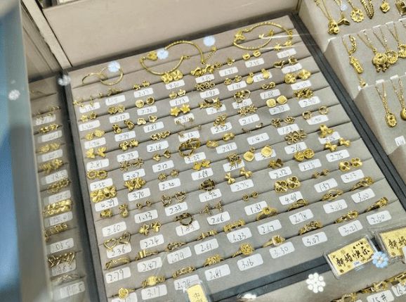 图为柜台中的黄金饰品