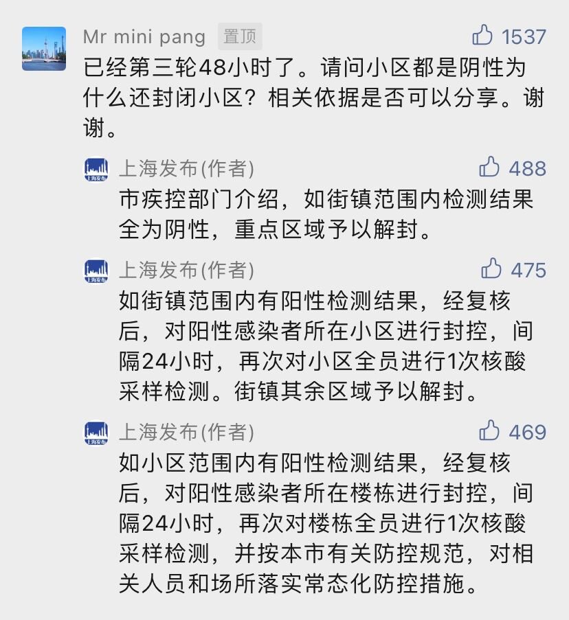 上海发布:还没有解除封控的小区,可能是您所在街道潜在风险还是比较大,街镇仍作为重点区域,也有可能仅仅是您所在小区还有潜在风险,需要再做一次核酸。请您理解、谅解。