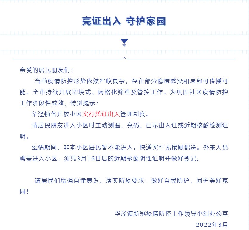 疫情期间,非本小区居民暂不能进入。快递实行无接触配送。外来人员确需进入小区,须凭3月16日后的近期核酸阴性证明并做好登记。请居民们增强自律意识,落实防疫要求,做好自我防护,同护美好家园!