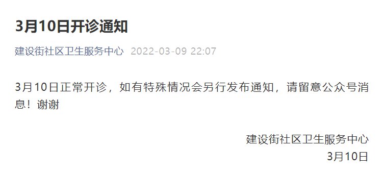 3月10日正常开诊,如有特殊情况会另行发布通知,请留意建设街社区卫生服务中心公众号消息!