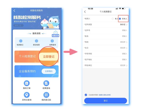 打开【核酸检测】服务页面点击【立即登记】,如非本人登记,请选择【非本人】,填写被登记人详细信息。有条件的可以把登记二维码打印出来。