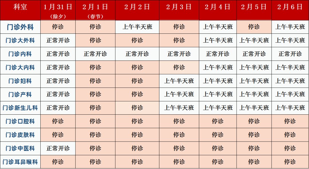 根据国务院办公厅《关于2022年节假日安排的通知》精神,春节1月31日至2月6日放假调休,共七天。广州白云山医院结合医院实际情况春节假期开诊安排如下,另外,医院急诊内外科春节期间正常值班。