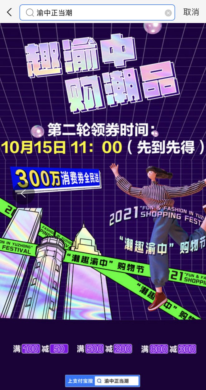 领取方式:活动期间,可通过支付宝搜索[渝中正当潮] 或 扫描支付宝二维码领取消费券