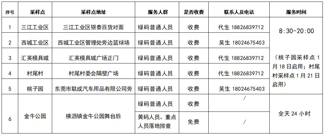 为更好地满足群众的检测需求,横沥镇在原有的5个采样点基础上,增设桃子园便民采样点,将于1月18日启用;另外,村尾村采样点将于1月21日启用。