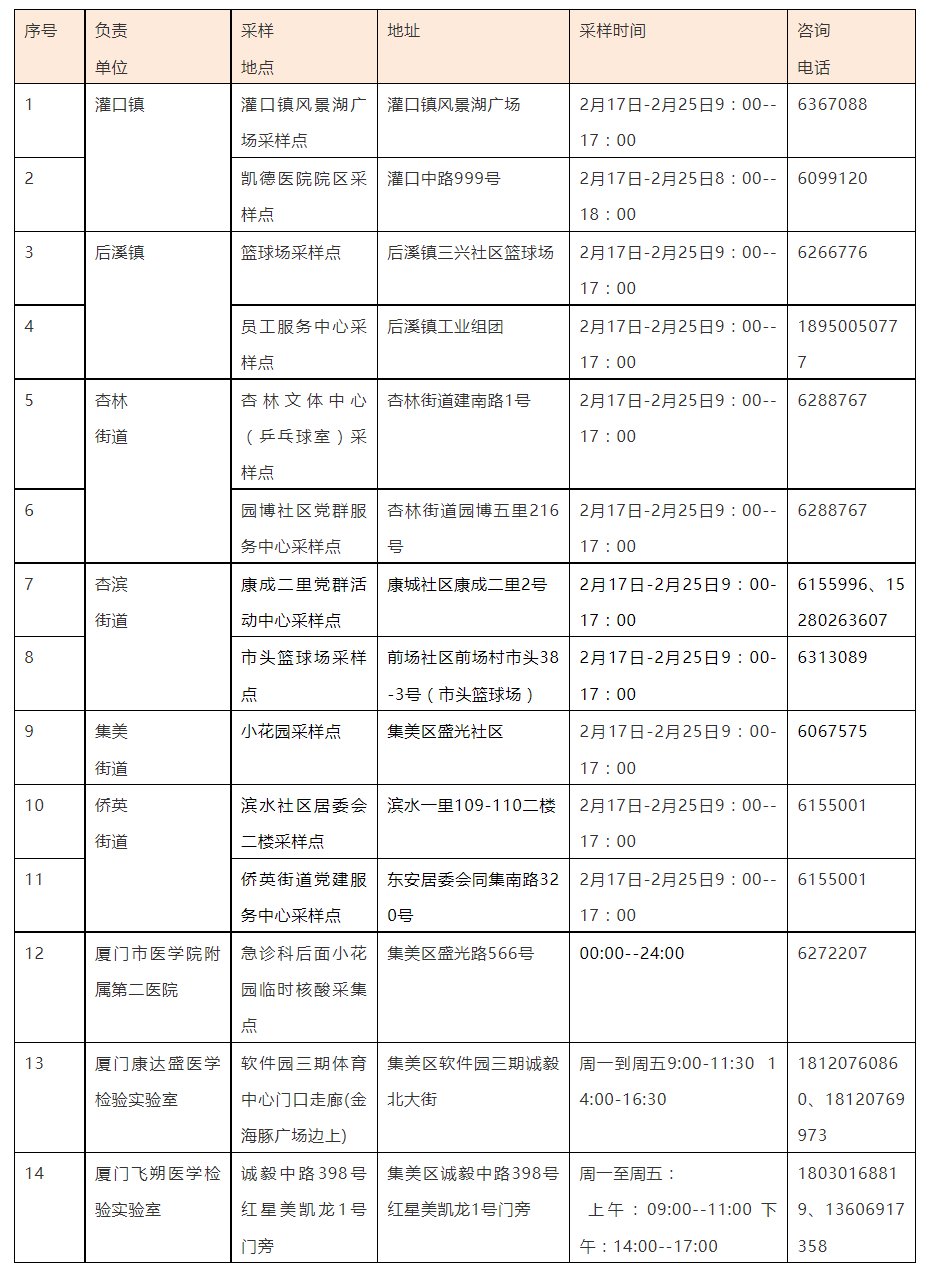 2月17日起 集美核酸检测点位有调整(现有14个免费检测点)