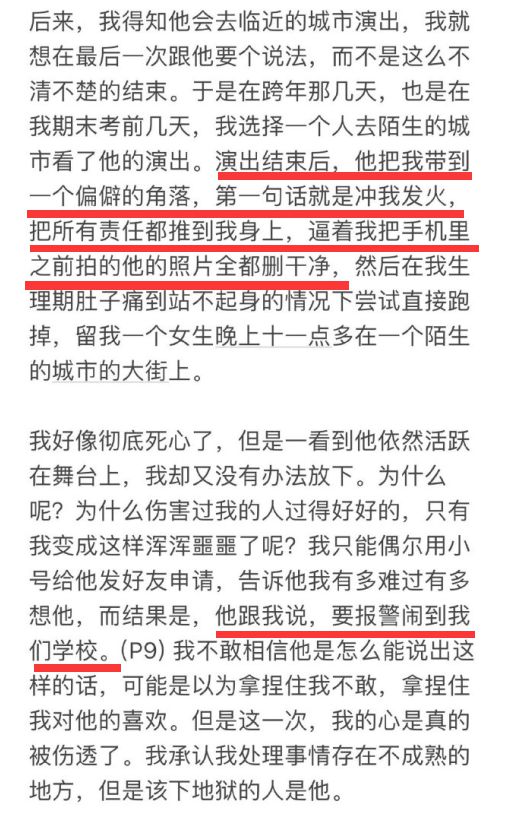 后来,女粉丝曾经鼓足勇气去找他讨要说法,她再次去看了杨波的演出,演出结束后,杨波把她带到一个偏僻的角落,第一句话就是冲她发火,还把所有责任推到她身上,逼着她删除手机里的照片。