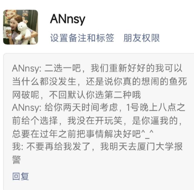 最后,这位女生还对杨波的女友说了一些话,客观上是伤害了她,但是不知道杨波女友出于什么样的心态,在发现男友出轨的第一时间选择威胁同为受害者的她。