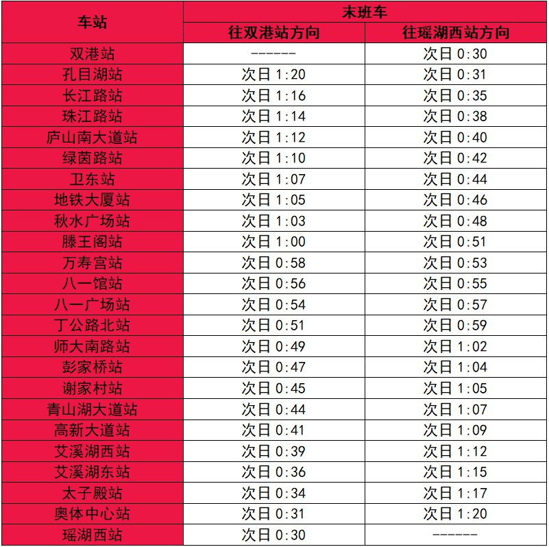 (3)南昌地铁1号线加开末班车时刻表(2021年12月31日):