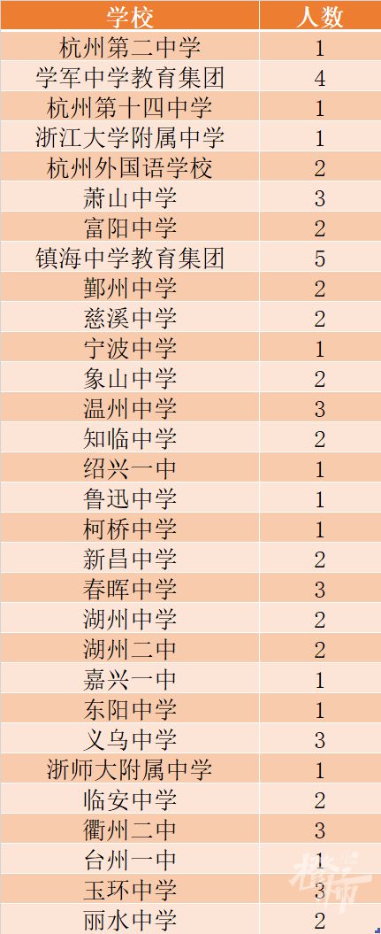 比如镇海中学教育集团5人,学军中学教育集团4人,温州中学3人,乐清知临中学2人、杭州外国语学校2人,杭州第二中学1人,杭州第十四中学1人。