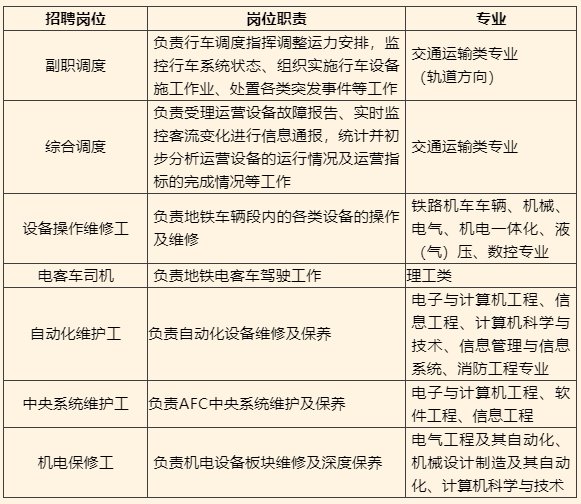 南京地铁运营有限责任公司根据后期新线开通运营需要,现面向全国院校招聘副职调度、综合调度、电客车司机、设备操作维修工、机电保修工等岗位。欢迎符合岗位要求、专业对口、有志于从事地铁运营工作的2022届全日制毕业生报名应聘。现将有关事项公告如下: