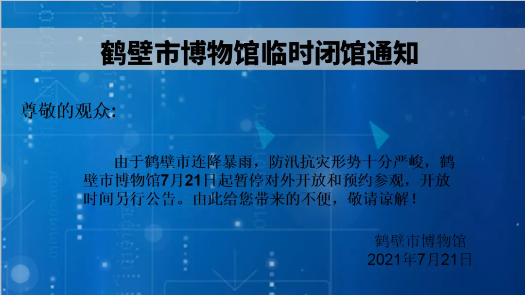 由于鹤壁市连降暴雨,防汛抗灾形势十分严峻,按照省政府特急通知,鹤壁市博物馆7月21日起暂停对外开放和预约参观,开放时间另行公告。由此给您带来的不便,敬请谅解!