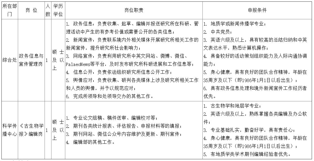 中国科学院南京地质古生物研究所招聘启事