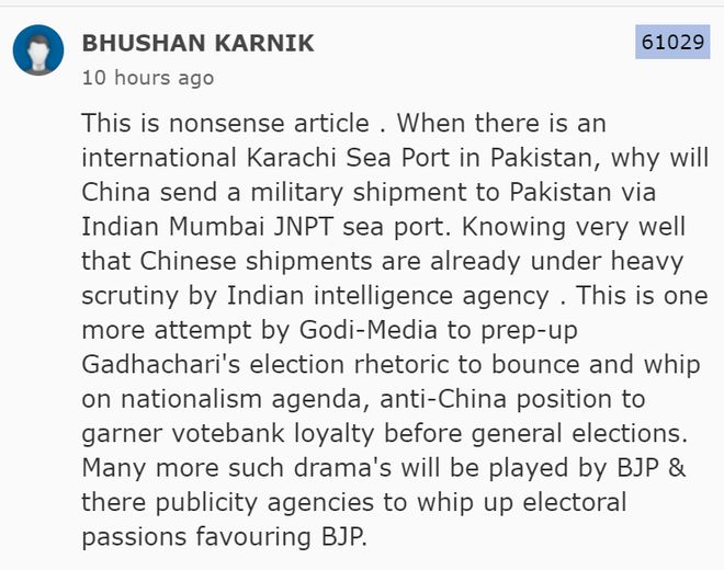 “这是一篇毫无意义的文章。巴基斯坦有国际港口卡拉奇,为什么中国要通过印度孟买‘尼赫鲁港口’(又名‘那瓦舍瓦港口’)向巴基斯坦运送军用物资?”该网友还指责这是“Godi-Media”(形容媒体报道的贬义词)的又一次尝试,通过煽动民族主义议程、表明反华立场,为有关选举做准备。”↓