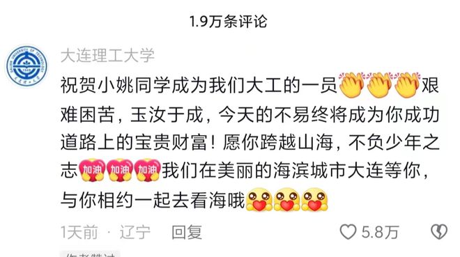 在大连理工的推文评论区,点赞量第一是一位网友的叮嘱:照顾好千千万万个“小姚”。校方给出的回复是坚定的两个字:一定!