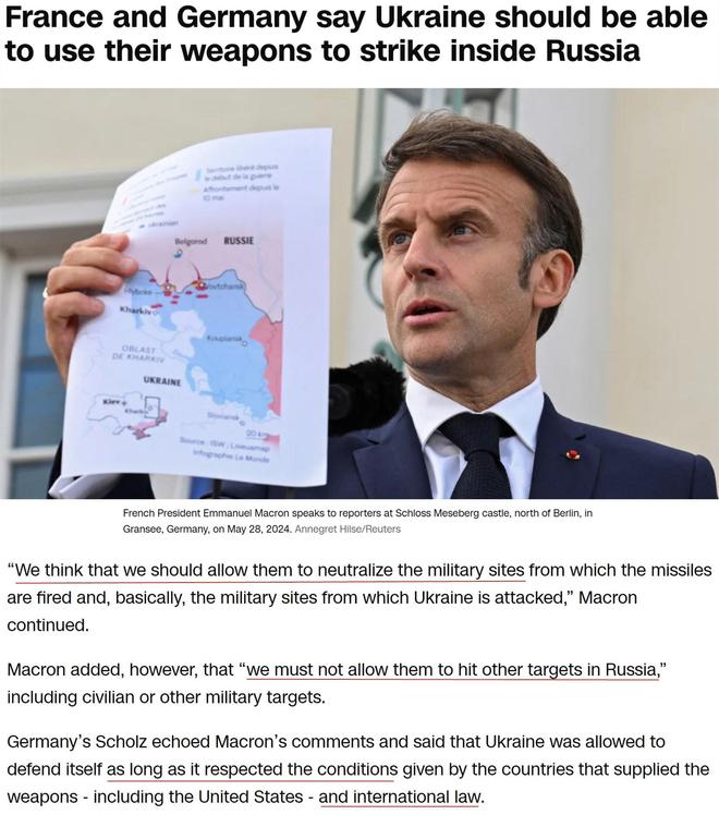 法国总统马克龙5月28日访问德国时说,应当允许乌方使用西方武器打击从俄罗斯境内向乌克兰发射导弹的军事设施,不过他补充说,"不应允许乌克兰打击俄罗斯其他目标,包括民用设施或其他军用设施"。