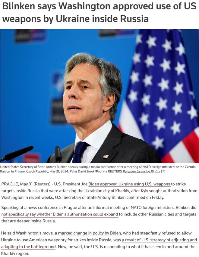 布林肯证实,美国总统拜登已经批准乌克兰可以使用美国武器对威胁乌克兰哈尔科夫地区的俄罗斯本土目标进行打击
