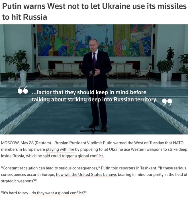 对这番言论,俄罗斯总统普京警告说,一些西方国家提议允许乌克兰使用外国援助武器袭击俄罗斯境内目标是在玩火,那样做会引发"严重后果"。