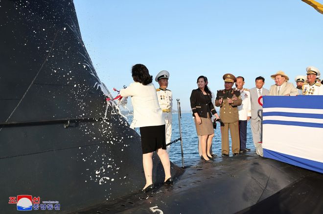 9月8日晚8时,朝鲜中央电视台的晚间新闻头条,用半个小时对朝鲜第一艘核攻击潜艇“金君玉英雄”号下水进行报道。崔善姬投掷香槟的一幕,是朝鲜首次对外展示世界海军通行的新船下水掷瓶礼。