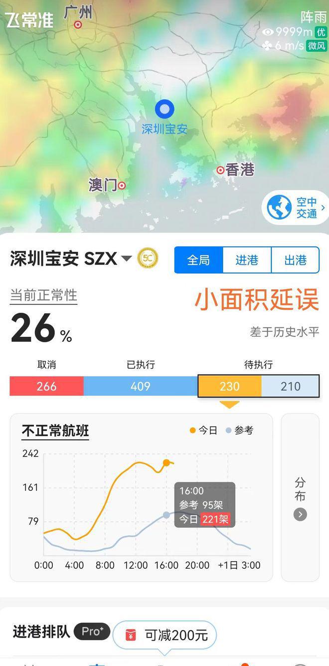 而深圳宝安国际机场的航班正常率在15日下午4时35分时降至26%,取消航班数量达266班次。此外,还有230班次航班延误2小时以上。成都往返深圳宝安国际机场的航班正常率不足29.5%。
