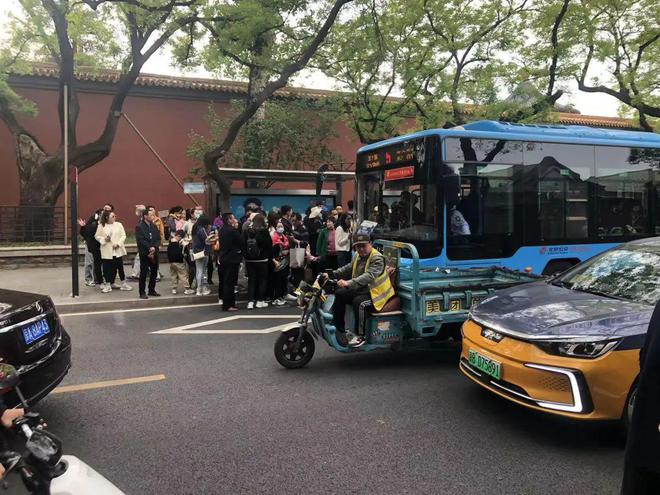 以景山西街为例,道路两侧有北海公园和景山公园,同时又靠近故宫,这里的公交站在这条街上是个明显的堵点。无论是站台还是公交车,能容纳的人数早已超负荷。小小的公交站台上,等公交车的游客数以百计,便道甚至机动车道上都站满了人。