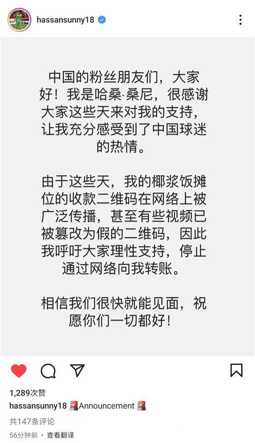 桑尼写道:中国的粉丝朋友们,大家好!我是哈桑·桑尼,很感谢大家这些天来对我的支持,让我充分感受到了中国球迷的热情。由于这些天,我的椰浆饭摊位的收款二维码在网络上被广泛传播,甚至有些视频已被篡改为假的二维码,因此我呼吁大家理性支持,停止通过网络向我转账。相信我们很快就能见面,祝愿你们一切都好!