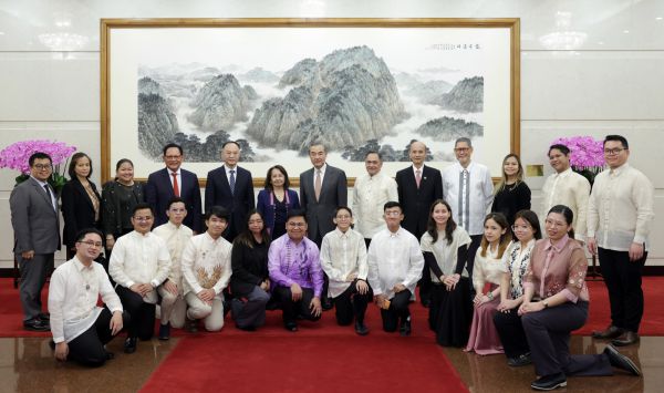 会见前,王毅与随同阿罗约来访的菲律宾青年合影留念并交流,勉励两国青年继承友好传统,增进相互了解,让中菲友谊代代相传。