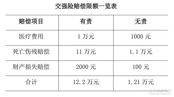 由此可见,交强险的赔偿划分为有责赔偿和无责赔偿两种类型,即与被保险人在交通事故中有无责任对应划分。有责赔偿无论责任主次大小,赔偿人身和财产总限额为12.2万元;无责赔偿即使责任全在受害人,亦应赔偿人身和财产损失总限额为12100元。