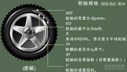 常见的轮胎尺寸型号有:【轮胎宽度mm】/【轮胎厚度和轮胎宽度百分比】R【轮辋直径(英寸)】【载荷系数】【速度标记】。