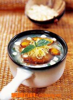 2、再将杏仁、百合分别洗净放入,慢熬至粥将成时,下冰糖,熬至糖溶粥即成。
