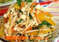 金针菇三百克,鸡脯肉一百五十克,胡萝卜半个,生姜十克,芥末五克,醋、白糖、盐与油和生抽都少许。