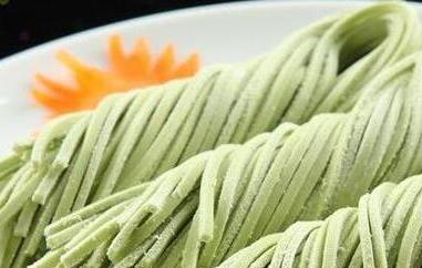 2、准备好擀面杖或全面条机,可以用擀面杖把揉匀的面团擀成面条也可以直接把它放在面条机中加工成面条,在锅中放清水加热烧开,把制好的面条放到清水中煮熟,取出以后放入适量香葱末生抽蚝油和麻油在淋上锅中的面汤调匀后就是美味的绿豆面条。