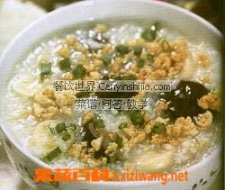 1、白米洗净,加水8杯浸泡20分钟,移到炉火上煮开,改小火熬粥。