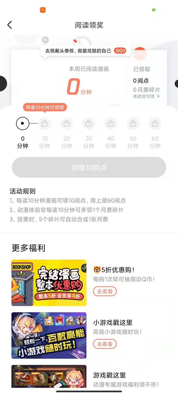 获得腾讯动漫阅点有5种方式,首充点券赠送、累计充值点券赠送;签到赠送;今日悬赏赠送、参加社区活动赠送;阅读时长兑换阅点;每周任务赠送。如果分享漫画之后阅点没有发放,是因为在分享得阅点活动的时候,需要您分享后立马点击返回腾讯动漫页面,否则无法获得奖励。阅点存在使用有效期,通过充值赠送、参与活动赠送获得的阅点有效期不同,有1天、3天、7天、31天不等,请合理使用避免造成不必要的损失。可在“我的账户”-“我的阅点”中查看阅点明细和过期提醒。