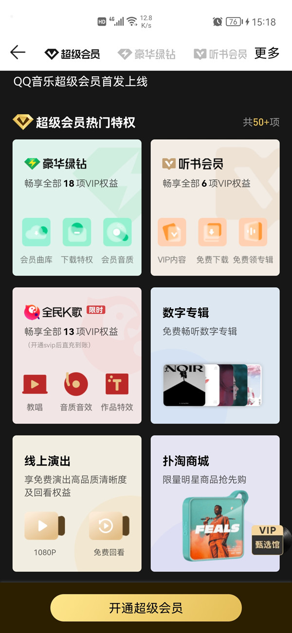" 超级会员 " 包含豪华绿钻的 18 项权益、听书会员 6 项权益、全民 K 歌 13 项权益,以及会员曲库、数字专辑、线上演出等总计 50+ 项权益。