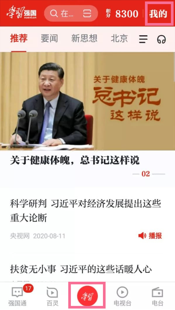 1、打开学习强国APP,点击底部的【学习】,点击右上角【我的】。
