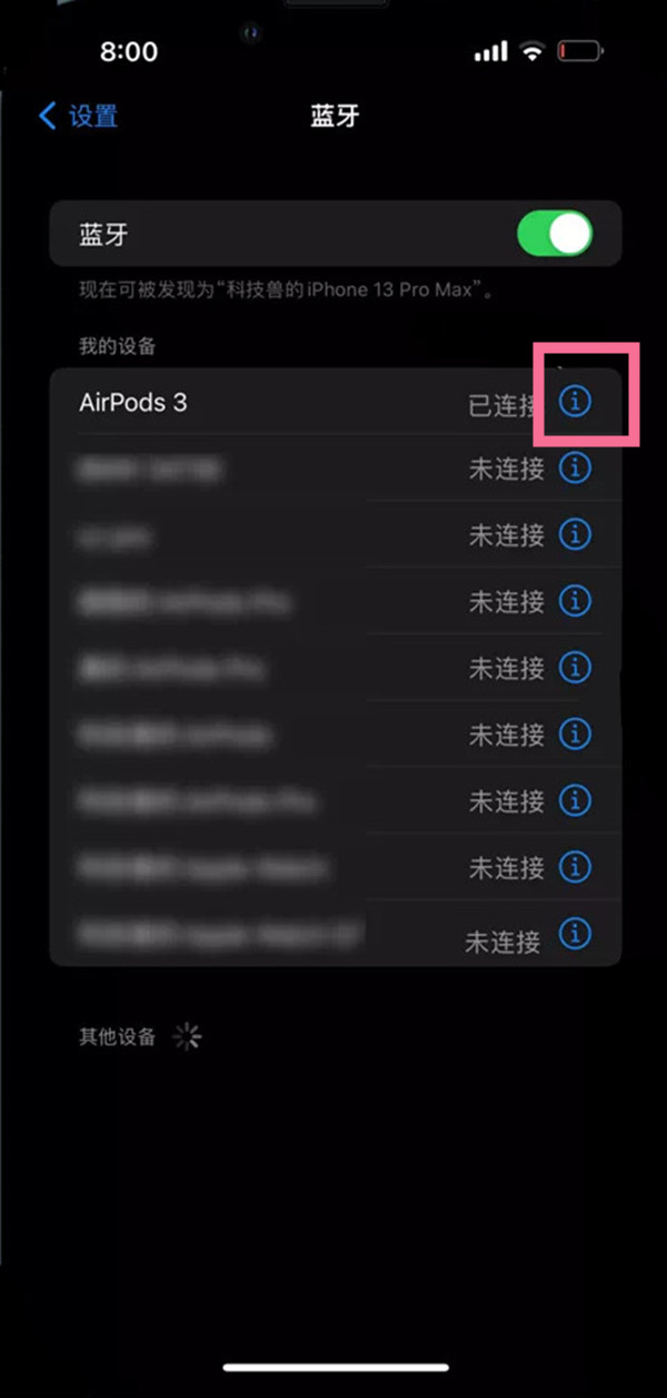 2、点击已连接耳机后面的“i”,下滑至底部点击【断开】即可。
