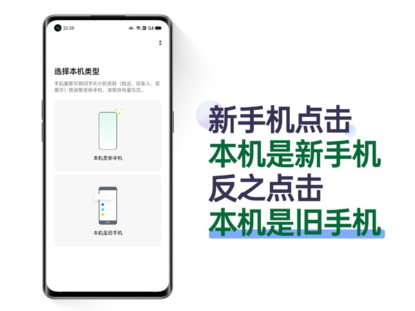 1、打开手机搬家APP,新手机在本机类型上选择“本机是新手机”,旧手机点击本机是旧手机。