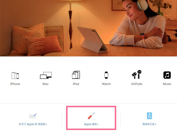 1、打开苹果官方网站,点击上方的 “技术支持” 进入售后服务页面,点击 “Apple 维修”。