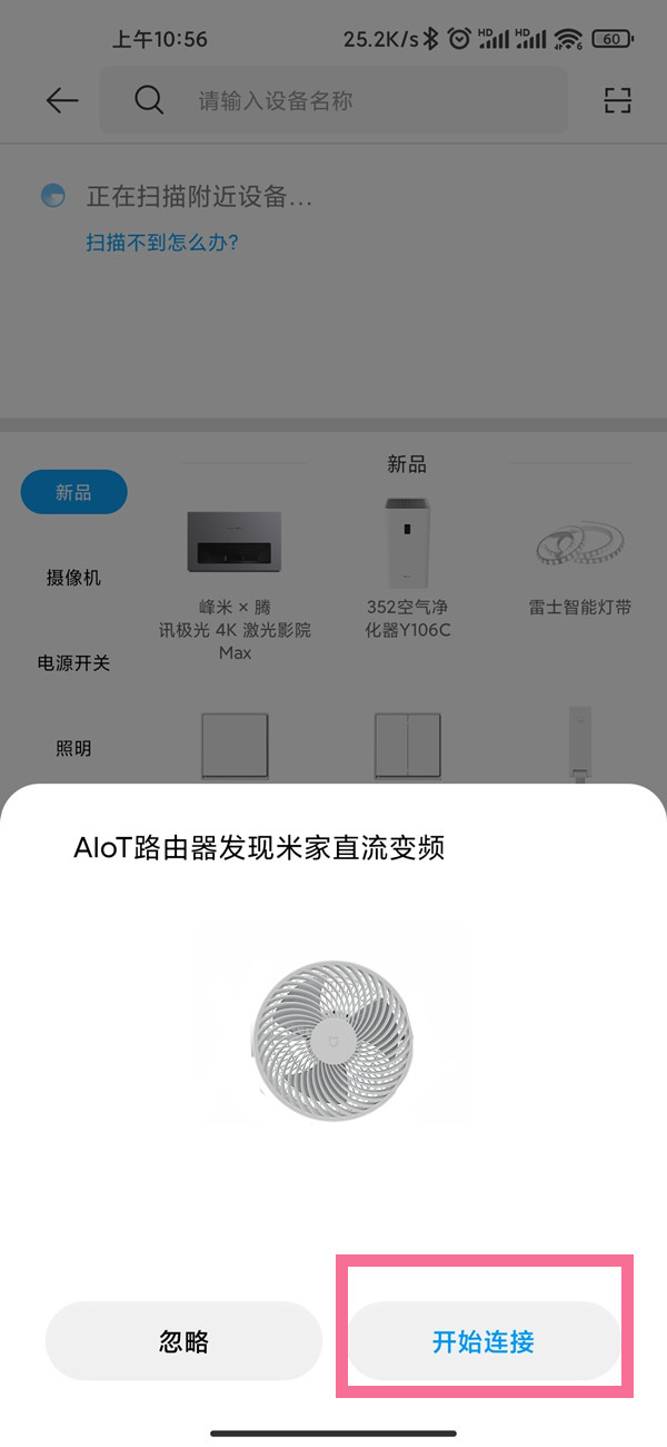 2、打开米家APP,点击右上角“+”号,从附近的设备添加或手动搜索电扇名称。