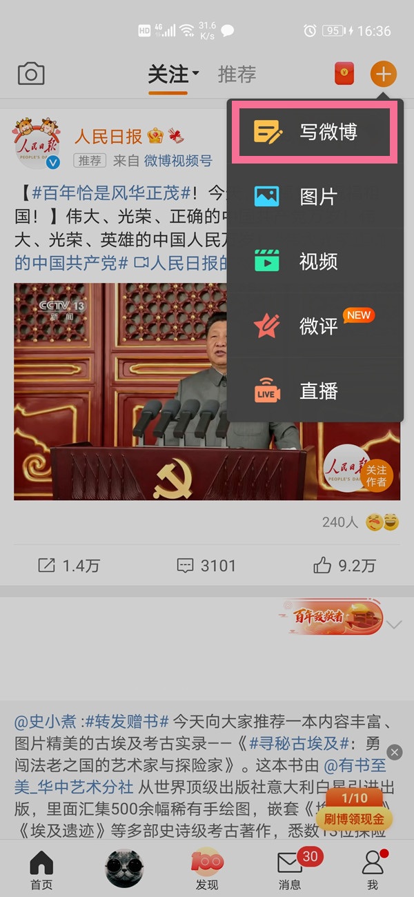 1、打开手机微博,点击右上角【+】,选择“写微博”。