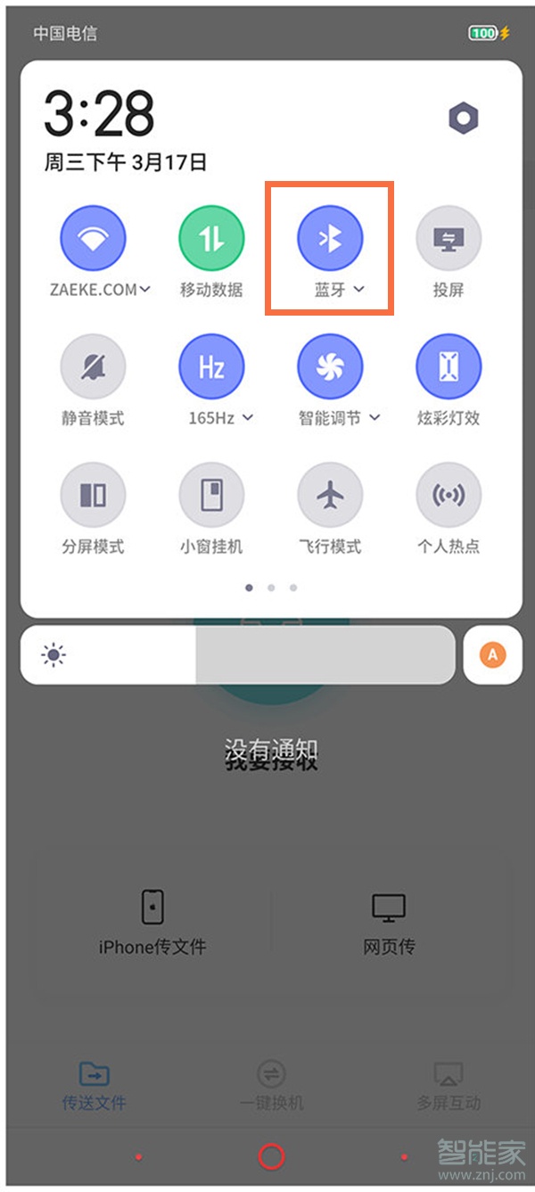 1、从屏幕顶部下拉控制中心,点击【蓝牙】即可。
