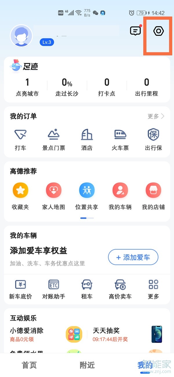 1、打开高德地图,在“我的”界面点击右上角的设置图标。