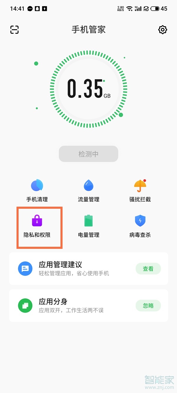 1、打开手机管家app,点击【隐私和权限】。