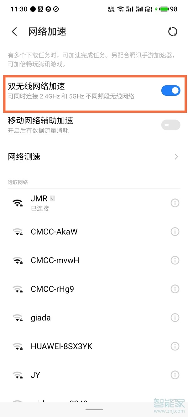 3、将【双无线网络加速】的开关开启即可。