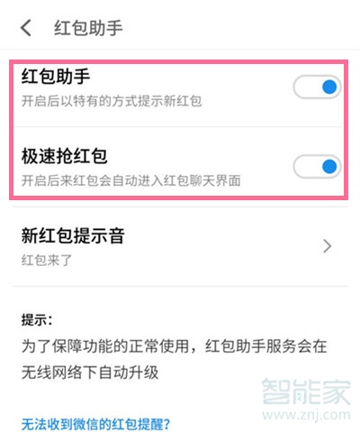 3、将【红包助手】和【极速抢红包】开关开启即可,还可以点击【新红包提示音】来设置提醒声音。