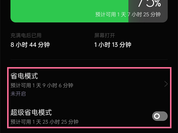 2、在电池设置页面,开启【省电模式】或者【超级省电】右侧的开关即可。