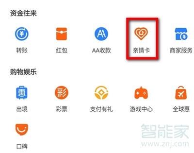 2、在资金往来一栏中选择“亲情卡”,也可以在首页直接搜索“亲情卡”,点击进入。