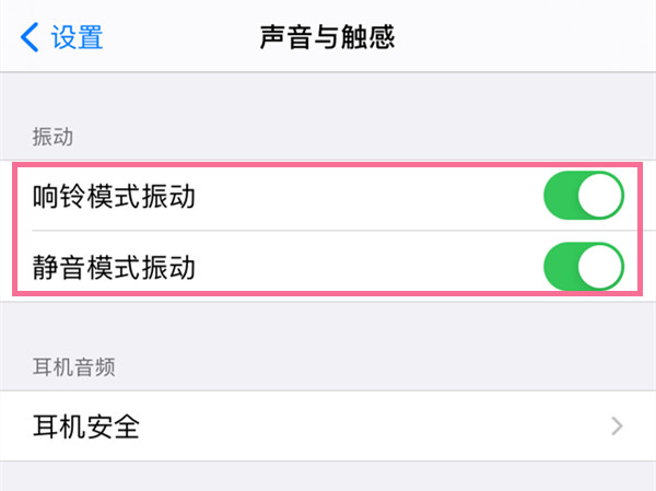 2、开启【响铃模式振动】和【静音模式振动】即可。