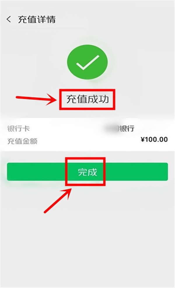4、等到弹出【充值成功】的提醒,点击【完成】,即可实现银行卡提现到零钱。
