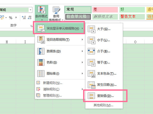 2、选择【突出显示单元格规则】,然后在新窗口中选择【重复值】选项即可。